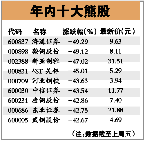 盡管截至上周五,大盤年內(nèi)跌666.40點,跌幅高達20.33%,不過,許多股票卻創(chuàng)出歷史新高。本報統(tǒng)計發(fā)現(xiàn),截至上周五,兩市A股中,有100多只股票年內(nèi)漲幅超過50%,20只股票年內(nèi)漲幅超過100%,三只股票年內(nèi)漲幅更是高達200%以上(含200%)。