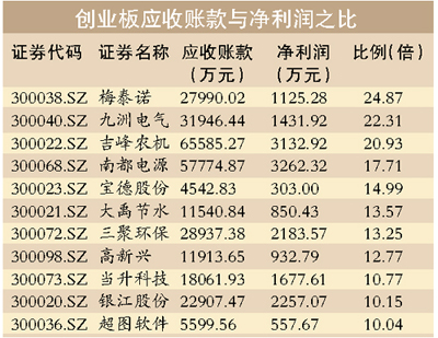 同花順資訊統(tǒng)計(jì)顯示,創(chuàng)業(yè)板公司應(yīng)收賬款竟是凈利潤(rùn)20倍以上的公司有3家,其中梅泰諾(300038)的應(yīng)收賬款竟是凈利潤(rùn)的24.87倍,位居榜首;九洲電氣(300040)的應(yīng)收賬款竟是凈利潤(rùn)的22倍,位居第二。應(yīng)收賬款與凈利潤(rùn)之比大于10倍的有11家。創(chuàng)業(yè)板中,應(yīng)收賬款最低的是三五互聯(lián)(300051.SZ),其中報(bào)凈利潤(rùn)為1694.27萬元,而應(yīng)收賬款僅為157.97萬元。