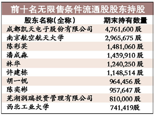 而從三季報(bào)看出,在成飛集成大漲的同時(shí),不少投資者斥巨資進(jìn)入。在十大股東中,除了成都凱天電子、南京航空航天大學(xué),以及西北工業(yè)大學(xué)外,新進(jìn)入了7大股東,累計(jì)增持的804.2萬股,其中陳彩英、潘成淼、林華等5人為自然人持股,蕪湖潤(rùn)瑞投資也以81萬股,成為第九大股東。沈文軍、張雪娟等已經(jīng)被踢出前十大流通股東。有市場(chǎng)分析師認(rèn)為,無論這5位自然人是什么來頭,都不愧為今年的最牛散戶。(張忠安)