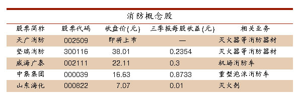 某不愿具名的私募人士向 《每日經(jīng)濟(jì)新聞》記者介紹,目前A股市場(chǎng)包括即將上市的天廣消防(002509)在內(nèi),涉及到消防器材及其相關(guān)領(lǐng)域的上市公司共有5家。其中,9月份剛登陸創(chuàng)業(yè)板的堅(jiān)瑞消防(300116,收盤(pán)價(jià)38.01元)和即將登陸深圳中小板的天廣消防均為一線消防設(shè)備生產(chǎn)制造商;威海廣泰(002111,收盤(pán)價(jià)22.11元)等公司為輔助設(shè)備生產(chǎn)制造商。