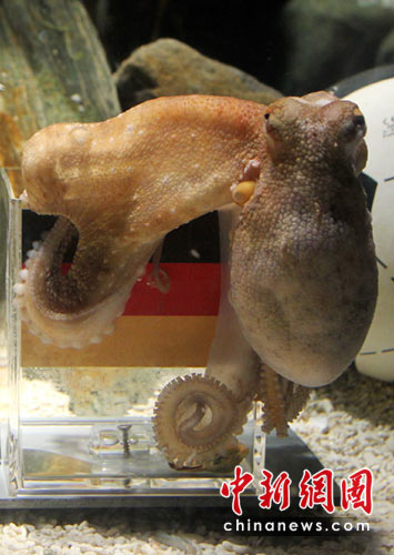 據(jù)悉,海洋館員把分別印有德、阿旗幟的貝殼放入玻璃缸,與對(duì)英格蘭隊(duì)比賽前脆快取出德國(guó)那枚貝殼不同,章魚“保羅”對(duì)德國(guó)和阿根廷的對(duì)決有些“猶豫不決”,“考慮了長(zhǎng)達(dá)一小時(shí)”但是最終還是取出了印有德國(guó)旗幟的貝殼。