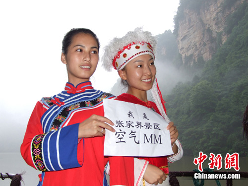 張家界國(guó)家森林公園空氣中負(fù)氧離子的含量達(dá)每立方厘米10萬(wàn)個(gè),是個(gè)名副其實(shí)的天然氧吧。為了吸引更多游客來張家界呼吸清新的空氣,兩位自稱“空氣妹妹”的少數(shù)民族女孩近日在張家界寶峰湖景區(qū)自發(fā)向中外游客推薦這一新特產(chǎn)——張家界空氣。周蘆屾 攝