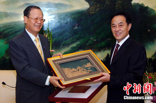 7月28日傍晚,中國最高人民法院副院長、中國法學(xué)會(huì)審判理論研究會(huì)副會(huì)長、二級大法官奚曉明先生(右)與海峽兩岸法學(xué)交流協(xié)會(huì)(臺灣)理事長廖正豪(左)先生互換禮物。當(dāng)日中國最高人民法院副院長奚曉明在福州福建會(huì)堂會(huì)見來自海峽兩岸的近二百名知名法學(xué)家、司法實(shí)務(wù)界人士,其中來自臺灣29名法學(xué)及司法嘉賓。海峽兩岸司法實(shí)務(wù)研討會(huì)即將在福州舉行。攝影:張麗君