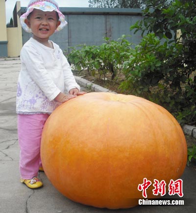 近日,山東省文登市劉家莊村鄒積泉老漢在果園收獲了一個67公斤重的巨型南瓜,令人們感到驚奇,引得周邊市民紛紛前來參觀。一些好奇的人對這一特大南瓜進行測量,南瓜重67公斤,直徑約0.64米,高0.60米,周長約2米。