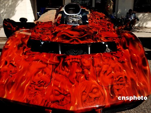 美國(guó)洛杉磯十月底萬(wàn)圣節(jié)前夕,街頭展示獨(dú)一無(wú)二的紅色魔鬼跑車(chē)。中新社發(fā) 賈國(guó)榮 攝