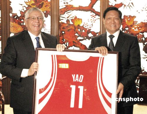 正在紐約出席聯(lián)合國大會(huì)的中共中央政治局委員、北京市委書記、北京奧組委主席劉淇,十一月一日會(huì)見美國職業(yè)籃球協(xié)會(huì)(NBA)總裁大衛(wèi)·斯特恩,斯特恩向劉淇贈(zèng)送了姚明在NBA火箭隊(duì)的十一號(hào)球衣。中新社發(fā) 李靜 攝