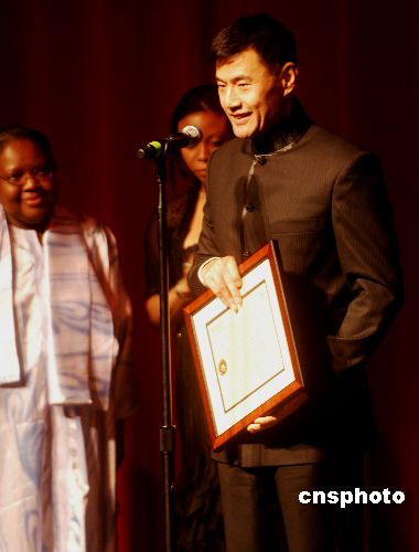 中美電影節(jié)十一月一日晚在好萊塢美國(guó)導(dǎo)演公會(huì)開(kāi)幕,聯(lián)合國(guó)兒童機(jī)構(gòu)一個(gè)協(xié)會(huì)特意向中國(guó)影星于榮光頒發(fā)和平發(fā)展親善大使證書(shū)。中新社發(fā) 賈國(guó)榮 攝