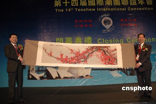 當(dāng)?shù)貢r間十一月四日,中國國務(wù)院僑務(wù)辦公室副主任馬儒沛(左)代表國僑辦向第十四屆國際潮團(tuán)聯(lián)誼年會贈送紀(jì)念品。中新社發(fā) 葛明 攝