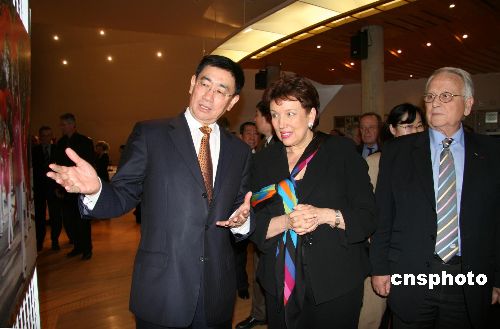 11月7日晚,由中國駐法使館和法國奧委會共同主辦的“北京歡迎您”迎奧運圖片展,在巴黎法國奧委會總部、法蘭西運動之家隆重開幕。旅法華人社團僑領(lǐng)等各界人士約400人出席了開幕儀式。圖為中國駐法大使趙進軍和法國衛(wèi)生、青年與體育部長巴舍洛-納爾坎女士,法國奧委會主席塞朗杜爾參觀圖片展。中新社發(fā) 鐘誠 攝