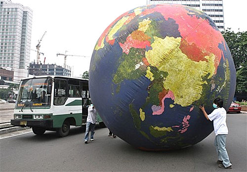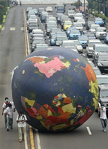 11月16日,印尼的環(huán)保主義者在首都雅加達推動一個巨大的充氣地球模型,參加此次“清潔空氣,控制溫度”活動。印尼是全球重要的溫室氣體排放國。今年12月印尼巴厘島將迎來聯(lián)合國氣候變化大會。