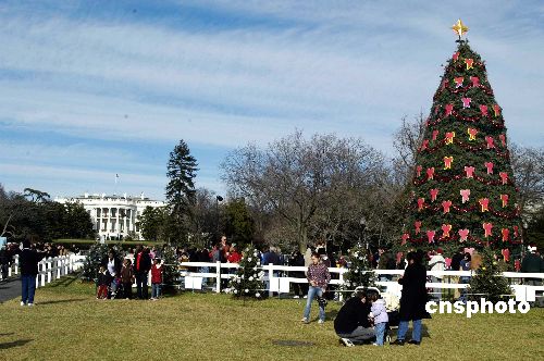當(dāng)?shù)貢r(shí)間12月24日,在圣誕節(jié)平安夜前,白宮門(mén)前巨大的圣誕樹(shù)吸引了眾多前來(lái)參觀的游人。一九二三年平安夜起,白宮前第一夫人格蕾絲就倡導(dǎo)在白宮門(mén)前每年插上圣誕樹(shù),并命名為“國(guó)家圣誕樹(shù)”,到一九七三年,當(dāng)時(shí)的白宮主人為了保護(hù)森林,下令停止每年砍伐樹(shù)木做圣誕樹(shù),叫人種植了一棵巨大的圣誕樹(shù),美國(guó)五十個(gè)州還送來(lái)小圣誕樹(shù)樹(shù)種在周?chē)员阌稳擞^賞。中新社發(fā) 邱江波 攝