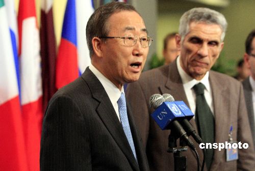 聯(lián)合國(guó)秘書長(zhǎng)潘基文(左)二十七日發(fā)表聲明,對(duì)巴基斯坦前總理、人民黨領(lǐng)袖貝·布托遇刺表示“震驚和憤怒”。他呼吁巴人民在此“困難時(shí)期”保持冷靜和克制,為和平和民族團(tuán)結(jié)共同努力。中新社發(fā) 李靜 攝