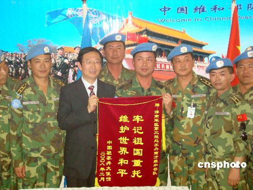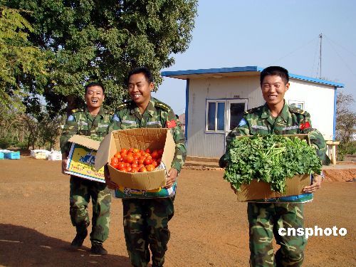 當(dāng)?shù)貢r(shí)間2月3日下午,中國(guó)駐蘇丹大使李成文在董建東武官的陪同下,帶領(lǐng)中國(guó)石油天然氣集團(tuán)公司代表一行5人乘專(zhuān)機(jī)前往蘇丹南部城市瓦烏,慰問(wèn)中國(guó)駐蘇丹維和工兵、運(yùn)輸、醫(yī)療分隊(duì)。李大使代表中國(guó)駐蘇丹大使館向維和部隊(duì)贈(zèng)送一面鑲有“牢記祖國(guó)重托、維護(hù)世界和平”字樣的錦旗及慰問(wèn)品。隨同的中國(guó)石油天然氣集團(tuán)公司代表向維和部隊(duì)贈(zèng)送1000余公斤新鮮蔬菜。中新社發(fā) 劉恩海 攝