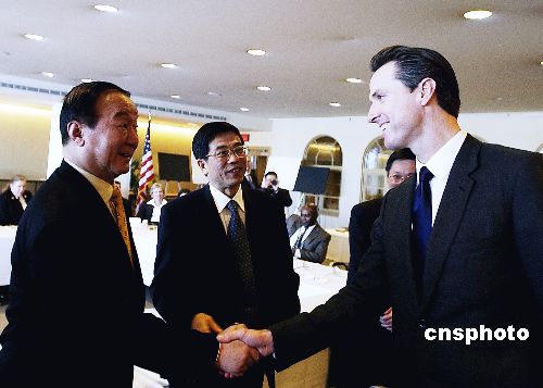 當(dāng)?shù)貢r(shí)間二月四日,北京奧組委執(zhí)行副主席蔣效愚和舊金山市長(zhǎng)紐森共同簽署了《第二十九屆奧林匹克運(yùn)動(dòng)會(huì)組織委員會(huì)與美國(guó)奧委會(huì)奧運(yùn)火炬接力服務(wù)協(xié)議》和《第二十九屆奧林匹克運(yùn)動(dòng)會(huì)組織委員會(huì)與舊金山市奧運(yùn)火炬接力服務(wù)協(xié)議》。圖為蔣效愚(左)高占生(中)和紐森在簽字儀式現(xiàn)場(chǎng)。中新社發(fā) 陳鋼 攝