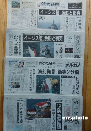 針對(duì)2月19日發(fā)生的日本宙斯盾軍艦撞沉漁船的事故,日本各大媒體連日來(lái)均在頭版頭條位置或者新聞節(jié)目的頭條時(shí)間突出報(bào)道,圖為19日至21日的合計(jì)發(fā)行量近2000萬(wàn)份的《讀賣(mài)新聞》和《朝日新聞》的頭版頭條報(bào)道。據(jù)報(bào)道,撞擊事件在日本政界引發(fā)了軒然大波,在野黨紛紛質(zhì)疑擁有“世界上最先進(jìn)的雷達(dá)系統(tǒng)”的軍艦為何突然不靈了,而首相福田則可能因此再次遭受新的打擊。中新社發(fā) 段躍中 攝