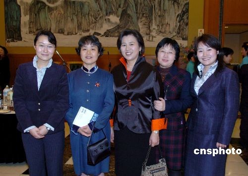 圖為崔天凱大使夫人倪培君(左2)、交流處參贊孫美嬌(中)和幾位年輕女外交官在招待會上合影。
