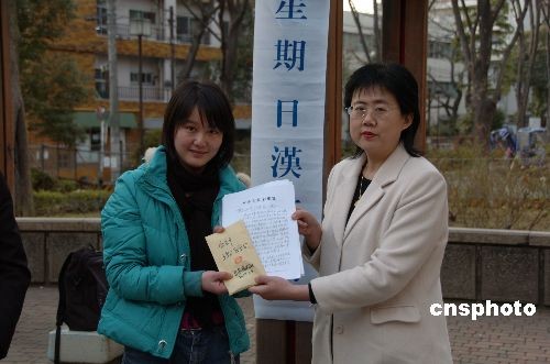 3月9日,日本東京漢語角舉行的第30次交流會(huì)上,日本僑報(bào)社社長張景子(右)代表中日兩國的捐款者,把全部捐款和寫給湖南省長周強(qiáng)的信,轉(zhuǎn)交給了正在日本訪問的湖南省人民對(duì)外友好協(xié)會(huì)干部曾卓然(左),表達(dá)大家對(duì)湖南災(zāi)區(qū)人民的關(guān)切之情。近一個(gè)月來,日本僑報(bào)社組織的為湖南災(zāi)區(qū)人民捐款活動(dòng),共收到4個(gè)團(tuán)體、53位日本友人和在日華人的全部捐款38.2885萬日元。中新社發(fā) 段躍中 攝