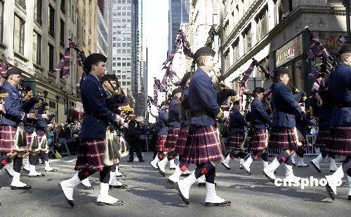 圖為身著愛爾蘭民族服飾的游行隊(duì)伍走過第五大道。