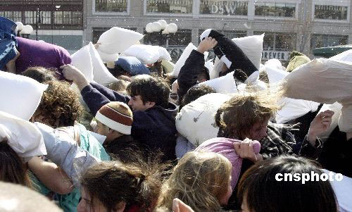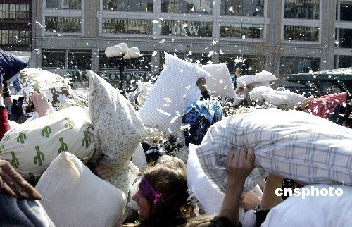 3月22日,紐約數(shù)百名青年聚居在曼哈頓聯(lián)合廣場(chǎng)展開(kāi)一年一度的枕頭大戰(zhàn)。大家用睡了一個(gè)冬天的枕頭將彼此“砸醒”,笑迎春天的到來(lái)。中新社發(fā) 鄧悅 攝