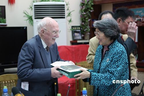 3月24日,俄中友協(xié)在莫斯科舉辦紀念周恩來誕辰110周年活動。圖為周恩來的侄女、原中國新聞社副社長周秉德向俄中友協(xié)名譽主席、著名漢學家齊赫文斯基贈送自己撰寫的《我的伯父周恩來》一書俄文版。齊赫文斯基在1949年前后擔任蘇聯(lián)駐北平(京)總領事,見證了中蘇建交的歷史。中新社發(fā) 田冰 攝