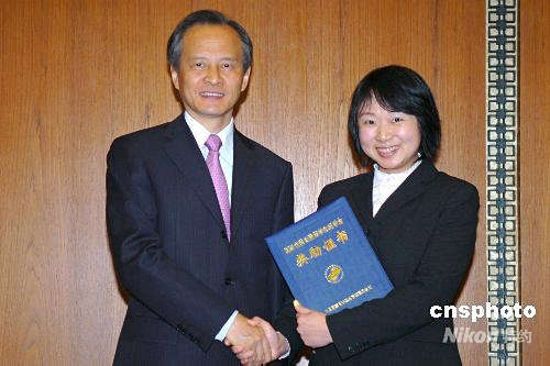4月13日,中國(guó)駐日使館舉行“2007年度國(guó)家優(yōu)秀自費(fèi)留學(xué)生獎(jiǎng)學(xué)金頒獎(jiǎng)儀式”,34名學(xué)子喜獲此項(xiàng)殊榮。根據(jù)統(tǒng)計(jì),截止于2007年5月1日,目前中國(guó)在日各類留學(xué)人員總數(shù)近十萬人,其中90%以上是自費(fèi)留學(xué)生。圖為中國(guó)駐日大使崔天凱向獲獎(jiǎng)學(xué)生頒發(fā)獲獎(jiǎng)證書。中新社發(fā) 朱沿華 攝