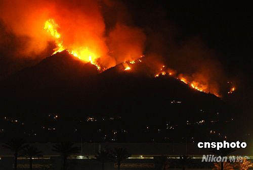 當(dāng)?shù)貢r間四月二十六日下午,距離洛杉磯市中心東北十幾英里的Sierra Madre發(fā)生山林大火。截至當(dāng)天午夜,大火仍在燃燒,估計(jì)過火面積約一百英畝,目前還沒有人員傷亡的報告。當(dāng)?shù)叵啦块T稱,起火原因可能與近期的干燥天氣有關(guān)。去年十月,洛杉磯地區(qū)發(fā)生大規(guī)模山林大火,數(shù)千人無家可歸。中新社發(fā) 張煒 攝