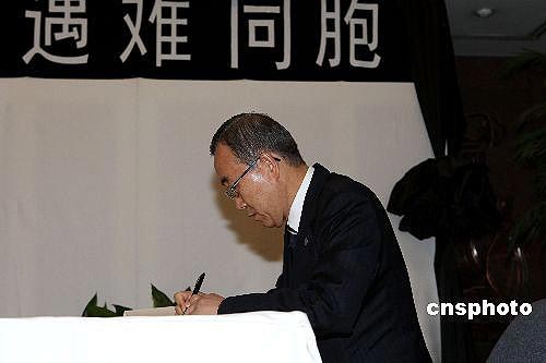 5月19日,聯(lián)合國(guó)秘書長(zhǎng)潘基文來到中國(guó)常駐聯(lián)合國(guó)代表團(tuán),向四川大地震遇難者表示哀悼。潘基文在吊唁簿上用中文寫道:哀悼罹難的中國(guó)人民。中新社發(fā) 譚宏偉 攝