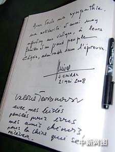 巴黎時間二十一日上午,法國前總統(tǒng)希拉克專程來到中國駐法國大使館,向中國汶川地震的遇難者表示深切哀悼。希拉克在吊唁簿上寫道:“對中國遇難者及他們的家屬表示深切的哀悼和慰問,對偉大的中國人民在此次抗震救災(zāi)中的表現(xiàn)表示欽佩! 作者:吳衛(wèi)中