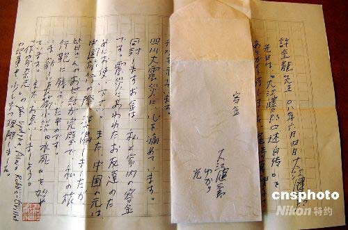 6月6日,日本著名作家、1994年度諾貝爾文學(xué)獎(jiǎng)獲得者大江健三郎,委托熟識(shí)的中國學(xué)者許金龍,替他將捐給中國四川地震災(zāi)區(qū)人民的10萬日元和200多元人民幣送到中國駐日大使館。他在給許金龍的親筆信中表示,四川大地震的災(zāi)情令他感到心痛,隨信附上的日元是他和妻子的一點(diǎn)兒心意,請(qǐng)使用于遭受震災(zāi)的朋友們。中新社發(fā) 朱沿華 攝