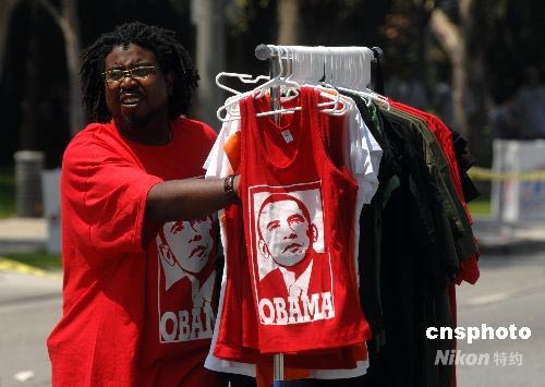 洛杉磯一名非裔小販在街頭兜售印有奧巴馬頭像的背心和T恤衫。目前,奧巴馬已穩(wěn)獲美國(guó)民主黨總統(tǒng)候選人提名,他得到了美國(guó)大多數(shù)非裔選民的強(qiáng)力支持。中新社發(fā) 張煒 攝