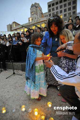 圖:美國(guó)女童為汶川地震遇難者點(diǎn)燃燭光