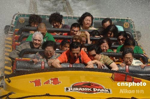當?shù)貢r間六月十八日,來自北京的旅游團成員在好萊塢“侏羅紀公園”享受驚險刺激。該旅游團于十七日晚抵達洛杉磯,他們是美國向中國旅游團正式開放后抵達洛杉磯的首批中國內(nèi)地游客,共有七十多人,以中老年人為主。他們將在美國東西海岸主要旅游城市停留十二天至十三天,每位游客的團費約兩萬元人民幣。中新社發(fā) 張煒 攝