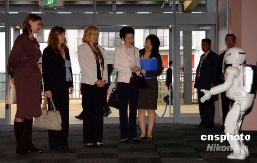 7月8日下午,在洞爺湖出席八國集團峰會的部分國家元首夫人,在日本第一夫人貴代子的陪同下參觀峰會環(huán)保型的國際新聞中心。日本公司研制的機器人asimo在門口迎接諸位夫人的到來,并用流利的英語和夫人們進行交流,令首腦夫人們驚喜不已。中新社發(fā) 朱沿華 攝