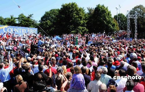美國共和黨總統(tǒng)、副總統(tǒng)候選人約翰·麥凱恩和薩拉·佩林10日現(xiàn)身大華盛頓地區(qū)的弗吉尼亞州菲爾法克斯郡為競選造勢,支持者高呼“麥凱恩--合眾國”的口號,手舉麥凱恩、佩林的標(biāo)語牌。中新社發(fā) 邱江波 攝