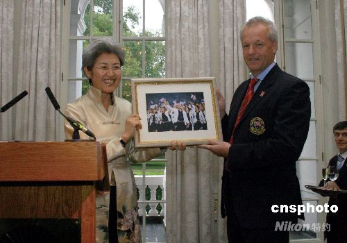 當(dāng)?shù)貢r間17日晚,中國駐英使館在倫敦文華東方酒店舉辦招待會,慶祝北京奧運會和殘奧會的閉幕。圖為中國駐英大使傅瑩(左)向英國奧委會首席執(zhí)行官西蒙·克萊格贈送英國隊進入鳥巢體育場時的照片。 中新社發(fā) 李鵬 攝