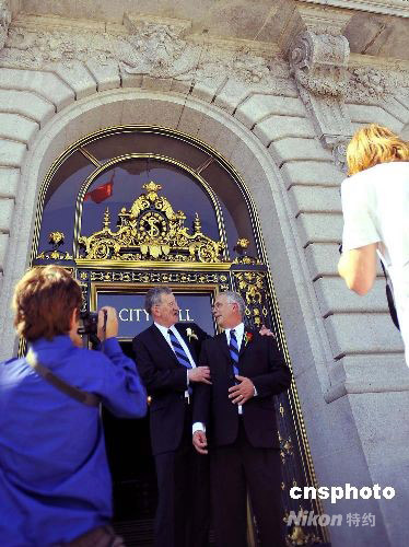 九月二十九日是美國舊金山同性戀伴侶麥卡弗和德斯勒相愛三十年的日子。三十年前的今天,他們在香港度蜜月。三十年后他們在舊金山市政府領取了結婚證書。加州最高法院裁定二00八年六月十六日是同性戀婚姻合法化的日子,但加州選民將在十一月再次對同性戀婚姻進行投票表決。中新社發(fā) 陳鋼 攝
