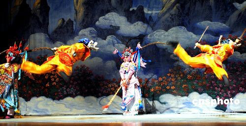 齊淑芳京劇團在“世界舞臺系列”演出。今年是齊淑芳京劇團在美國成立20周年,應(yīng)紐約大學SKIRBALL中心的邀請,10月5日,該團以《楊門女將》參加由十個國家輪流表演的“世界舞臺系列”中演出,為讓不懂漢語的觀眾看懂京劇《楊門女將》,齊淑芳京劇團在百老匯演出的腳本上作了重大修改,減少唱段,增加武打,使文戲動聽,武打精彩,劇情緊湊。中新社發(fā) 龔文謨 攝