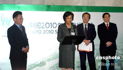 當(dāng)?shù)貢r間十月六日,“上海世博會聯(lián)合國圖片展”在紐約聯(lián)合國總部開幕。上海世博會執(zhí)委員常務(wù)副主任鐘燕群(中)介紹上海世博會籌備情況。聯(lián)合國副秘書長沙祖康(左)、副秘書長赤阪清隆(右二)和中國常駐聯(lián)合國代表張業(yè)遂出席開幕式(右)。該圖片展由上海世博會事務(wù)協(xié)調(diào)局、中國常駐聯(lián)合國代表團和上海市對外文化交流協(xié)會共同舉辦。中新社發(fā) 汪晨 攝