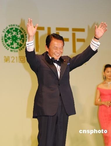 10月18日傍晚,第21屆東京國際電影節(jié)開幕。以“環(huán)!睘橹黝}的本屆電影節(jié)別出心裁地將星光大道的地毯由紅色改為綠色。上個月剛剛當選日本首相的麻生太郎與開幕影片《赤壁》劇組成員同走綠地毯,成為第一個光臨東京國際電影節(jié)現(xiàn)場的日本總理大臣。中新社發(fā) 侯宇 攝