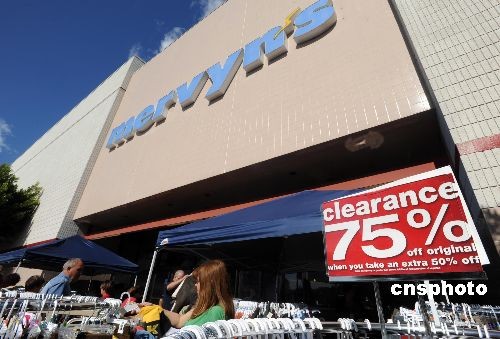 十月十八日,洛杉磯附近一家Mervyns百貨店打出削價(jià)百分之七十五清貨的告示,消費(fèi)者正在選購(gòu)清貨甩賣(mài)的服裝。擁有五十九年歷史的美國(guó)老牌連鎖百貨公司Mervyns剛剛成為美國(guó)經(jīng)濟(jì)滑坡的新?tīng)奚。這家已經(jīng)申請(qǐng)破產(chǎn)保護(hù)的百貨公司周五宣布,旗下一百四十九家商店進(jìn)行清貨銷(xiāo)售,然后關(guān)門(mén)停業(yè)。美國(guó)金融危機(jī)已經(jīng)蔓延到實(shí)體經(jīng)濟(jì),十月份美國(guó)消費(fèi)信心指數(shù)創(chuàng)下三十年來(lái)最大月度跌幅。中新社發(fā) 張煒 攝