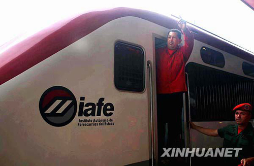 委內(nèi)瑞拉總統(tǒng)查韋斯站在一輛停放在亞拉圭州的中國制造動車組駕駛室門口揮手。