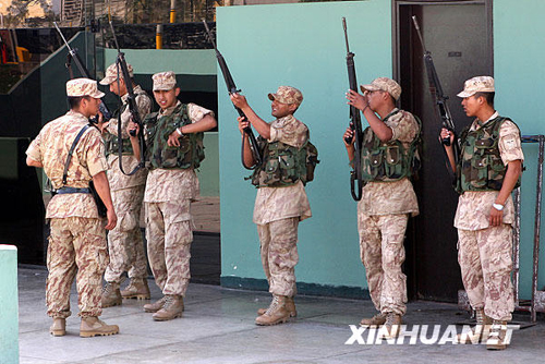 11月16日,在秘魯首都利馬的亞太經(jīng)合組織(APEC)領(lǐng)導(dǎo)人非正式會(huì)議國(guó)際新聞中心,執(zhí)勤士兵檢查槍械。秘魯軍方日前在利馬部署了近一萬名士兵,以確保將于11月22日至23日舉行的APEC第十六次領(lǐng)導(dǎo)人非正式會(huì)議安全舉行。