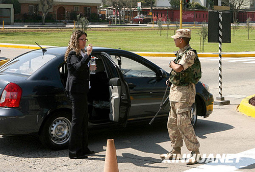 11月16日,在秘魯首都利馬的亞太經(jīng)合組織(APEC)領(lǐng)導(dǎo)人非正式會(huì)議國(guó)際新聞中心,執(zhí)勤士兵檢查車輛。新華社記者 張傳奇 攝