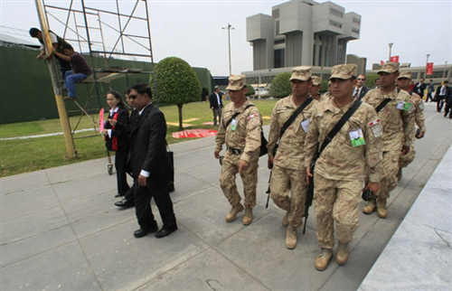 峰會期間,秘魯方面將安排3.9萬名警察在大街上巡邏,并用直升機將護送領(lǐng)導(dǎo)人衛(wèi)隊,而領(lǐng)導(dǎo)人們則將在戒備森嚴的秘魯國防部內(nèi)會面。