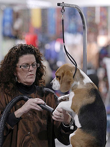 簡(jiǎn)·科尼克正在給小獵犬“洛拉”打理前爪。