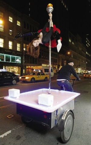 據(jù)美國媒體24日報道,美國紐約市44歲男子安德魯·卡贊德白天是一名庭園設(shè)計師,可一到晚上,他就成了一名鋼管舞業(yè)務(wù)老板。安德魯和25歲的紐約鋼管舞女教師瑪羅·費斯肯日前聯(lián)手推出了一項“三輪車鋼管舞”業(yè)務(wù),安德魯?shù)胖惠v特制的三輪車走街穿巷,而瑪羅則站在三輪車后面的平臺上大跳性感鋼管舞。當(dāng)這輛“鋼管舞”三輪車經(jīng)過紐約時代廣場時,將眾多司機和行人看得目瞪口呆,甚至引發(fā)了交通堵塞。