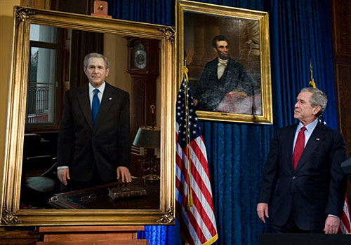 12月6日,美國(guó)總統(tǒng)布什在美國(guó)賓夕法尼亞州的費(fèi)城出席自己肖像畫的揭幕儀式。這幅肖像畫由馬克·卡德爾創(chuàng)作。
