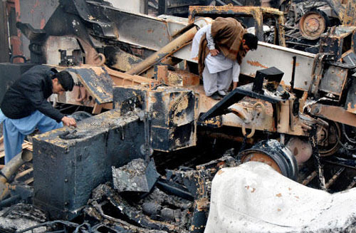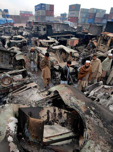 駐阿富汗美軍和北約部隊(duì)設(shè)在巴基斯坦境內(nèi)的兩個(gè)后勤轉(zhuǎn)運(yùn)站7日幾乎同時(shí)遭武裝分子偷襲,至少有160輛大貨車被炸毀。這是駐阿美軍后勤補(bǔ)給線遭受的最慘痛損失。據(jù)悉,本次襲擊發(fā)生在巴基斯坦西北部邊境城市白沙瓦附近的貨場(chǎng)內(nèi)。