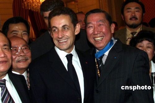 當(dāng)?shù)貢r(shí)間12月18日晚,法國(guó)總統(tǒng)薩科齊在總統(tǒng)府愛(ài)麗舍宮為旅法華人何;壬(右)頒授司令級(jí) “法國(guó)榮譽(yù)軍團(tuán)勛章”。薩科齊稱贊何;灶B強(qiáng)的奮斗精神,在法國(guó)取得了很大的成功,多年來(lái)不忘參與法國(guó)當(dāng)?shù)氐恼紊詈凸婊顒?dòng)。中新社發(fā) 蘇宜 攝