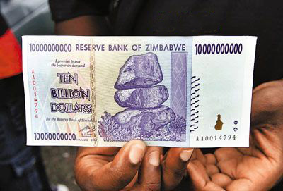 津巴布韋政局動蕩,經(jīng)濟(jì)惡化和嚴(yán)重通脹,央行前日起正式發(fā)行面額為10億、50億和100億的新鈔,創(chuàng)下世界之最。該國一周前才發(fā)行了面額1千萬、5千萬和1億的3種新鈔。
